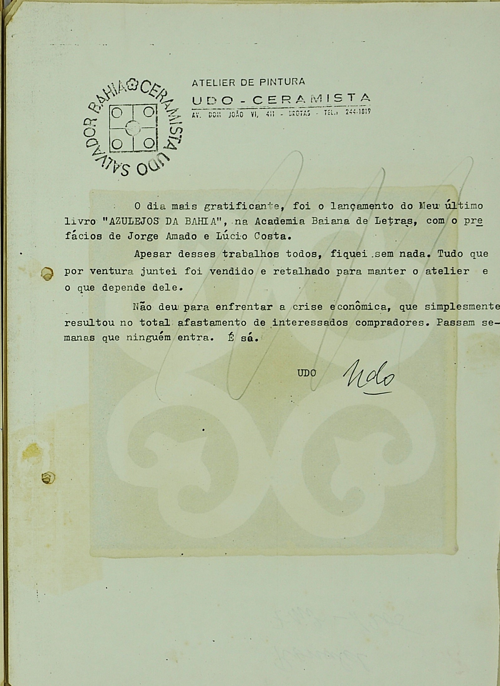Sua estreia na cidade foi registrada no jornal A Tarde de 5 de janeiro, que noticiava a exposição de seus trabalhos em cerâmica. A nota comunicava, também, que era seu desejo residir e ensinar a arte do barro em Salvador. No dia 28 de janeiro, o mesmo diário informava: “Udo vai ficar na Bahia”.